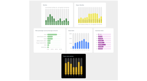 Chart Widgets provide smaller and simpler chart views for many different chart types ideal for use in dashboards. Widgets are optimized for glanceable data visualization including custom chart indicators, gauges, label charts, label typography and more.