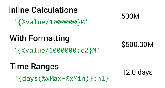 Advanced label calculations with custom formatting and time range support can be set using simple to understand expressions. Save extensive coding for label formatting using the integrated seamless functionality provided with JSCharting.